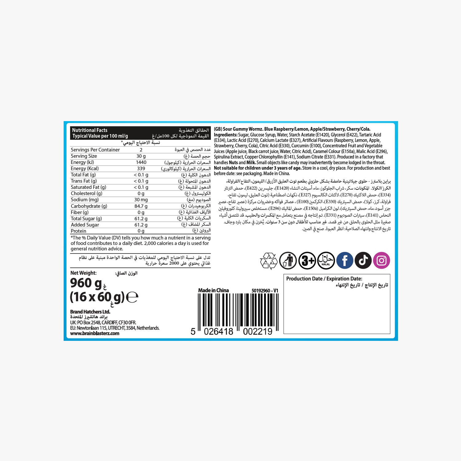 Brain Blasterz Sour Gummy Wormz 60G